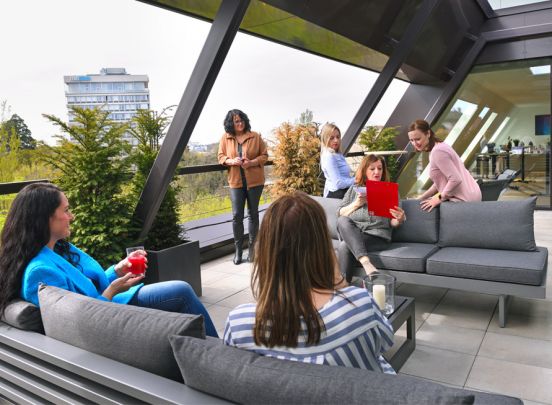 Der 100qm große, helle und freundliche Seminar- und Tagungsraum verfügt über eine ansprechende Dachterrasse (ca. 30qm) mit Sitzgelegenheiten und einen großzügigen Get-together Bereich mit Stehtischen (ca. 70qm).